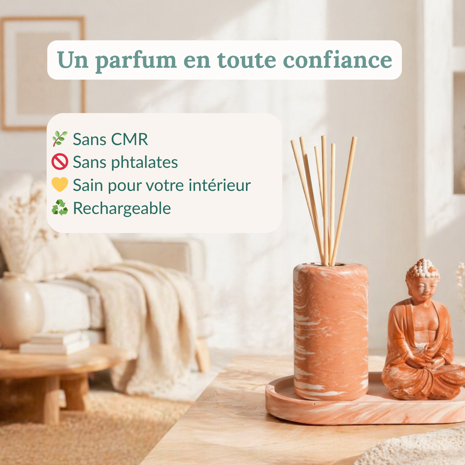 Parfums certifiés sans perturbateurs endocriniens, sans CMR et sans phtalates, pour parfumer votre intérieur en toute sérénité.