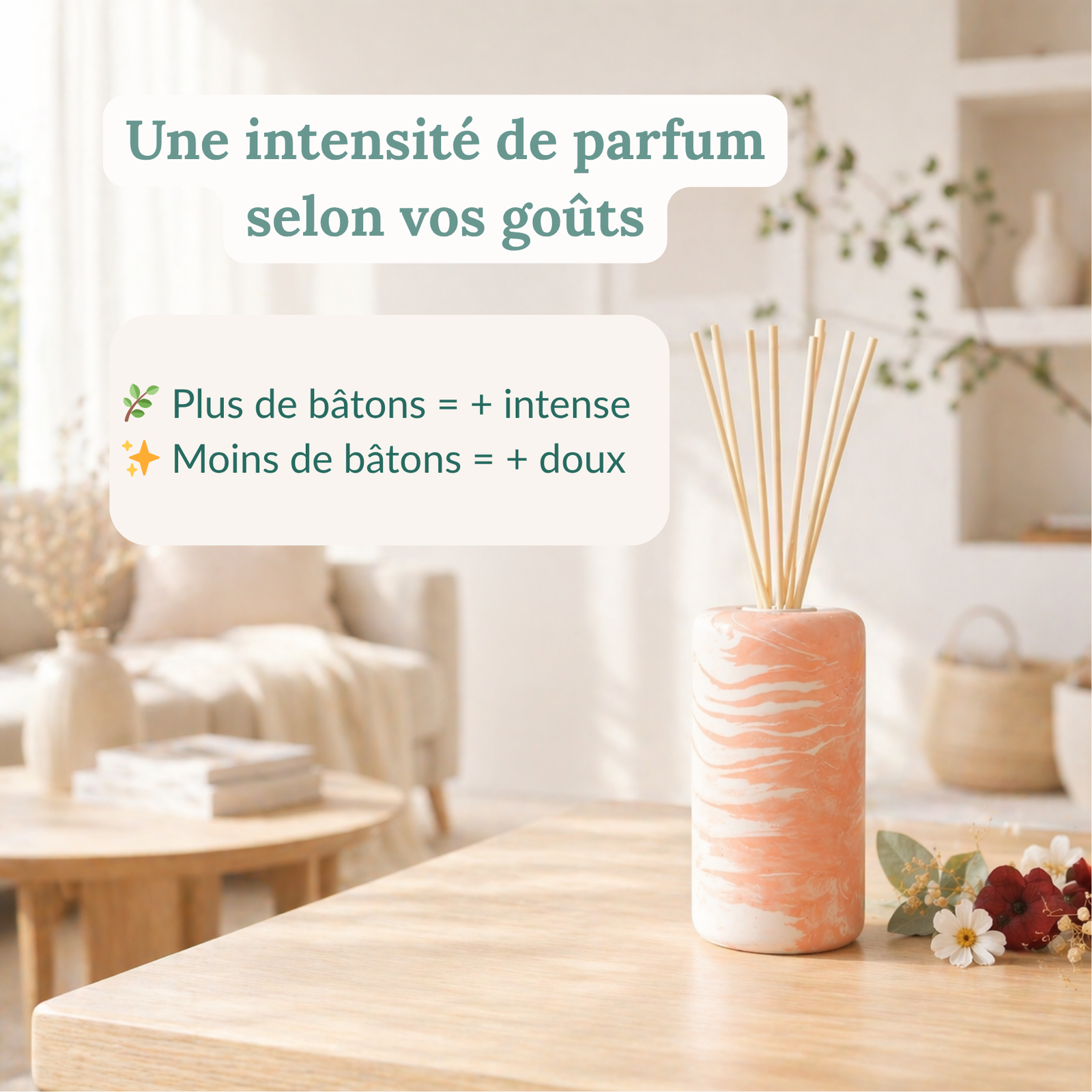 Les bâtons diffusent progressivement le parfum pour une présence constante et subtile, jusqu’à 6 mois.